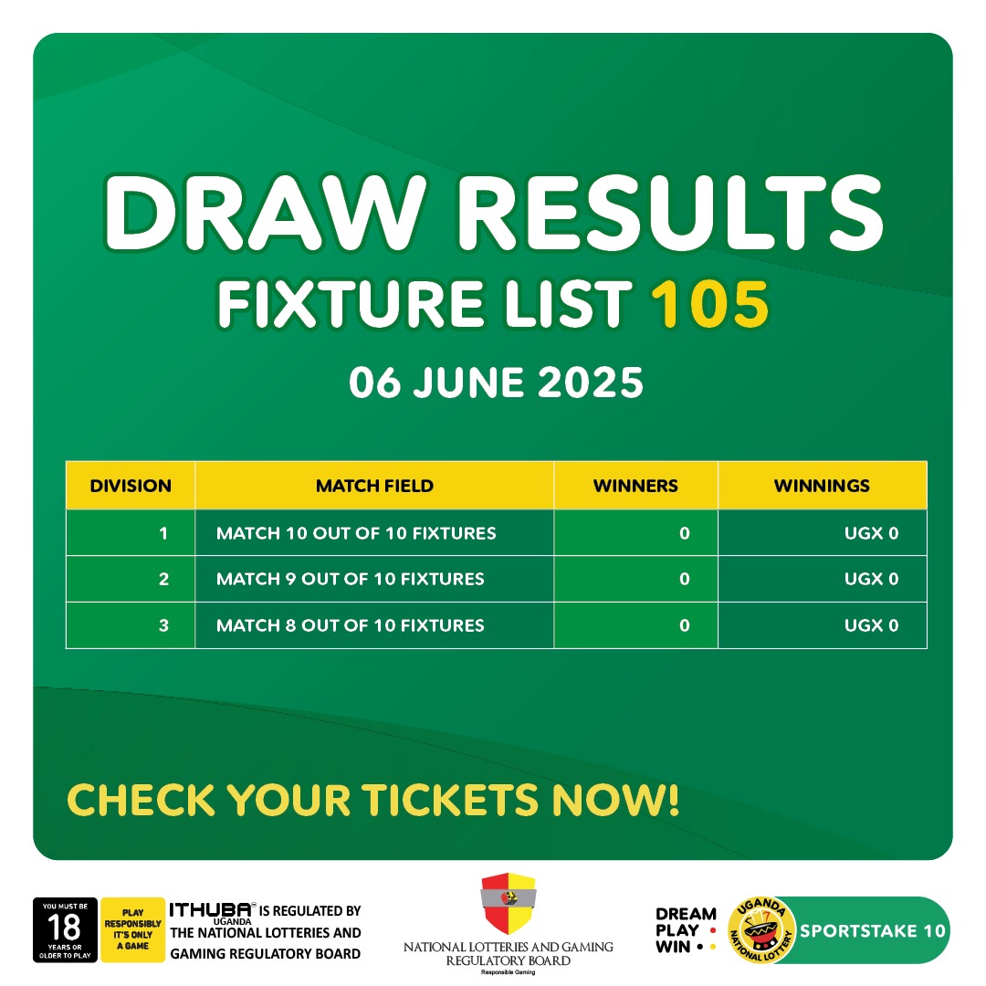 Here are the #SPORTSTAKE10 fixture list 105 results for Friday 06/06/2025.Players must be 18 years or older, play responsibly. ITHUBA Uganda is the proud operator of the Uganda National Lottery.#UgandaNationalLottery#Sportstake10