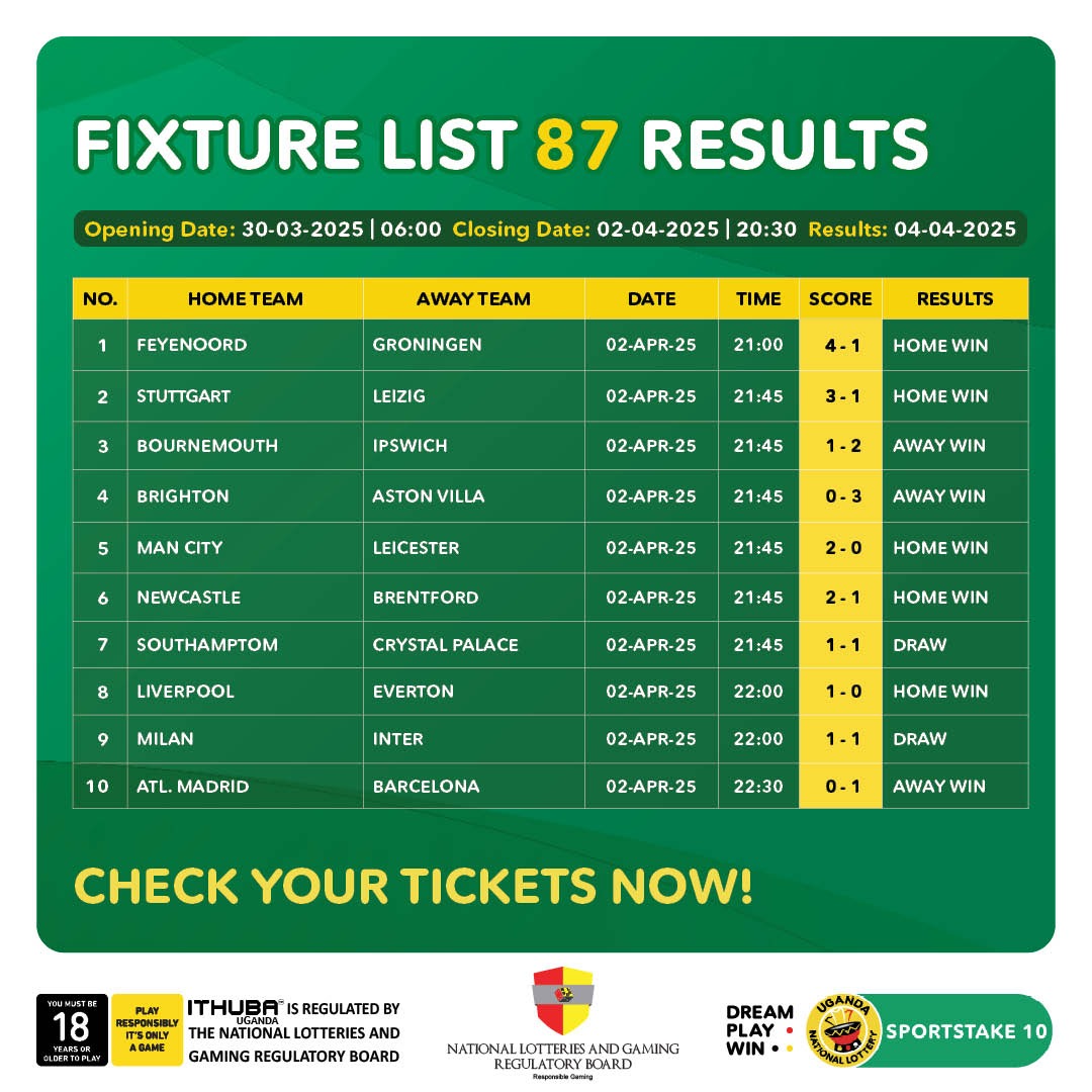 Here are the #SPORTSTAKE10 fixture list 87 results for Friday 04/04/2025.#MillionZzizino#UgandaNationalLottery#Sportstake10