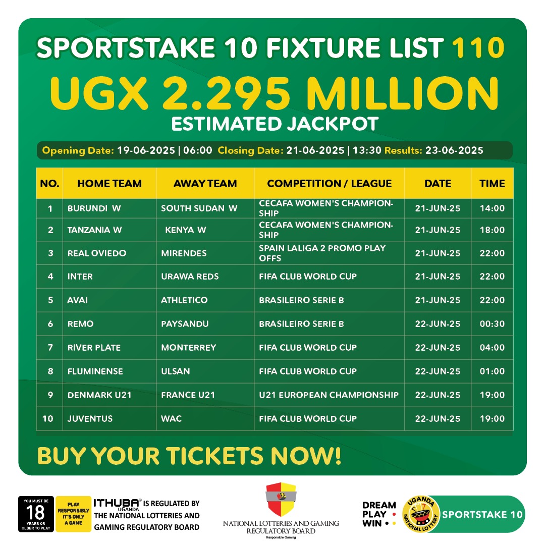 Here is the #SPORTSTAKE10 upcoming fixture list 110 with an ESTIMATED Jackpot of UGX 2.295 Million for Monday 23/06/2025. PLAY NOW at any authorised shop near you, or on https://bit.ly/4eMCQba