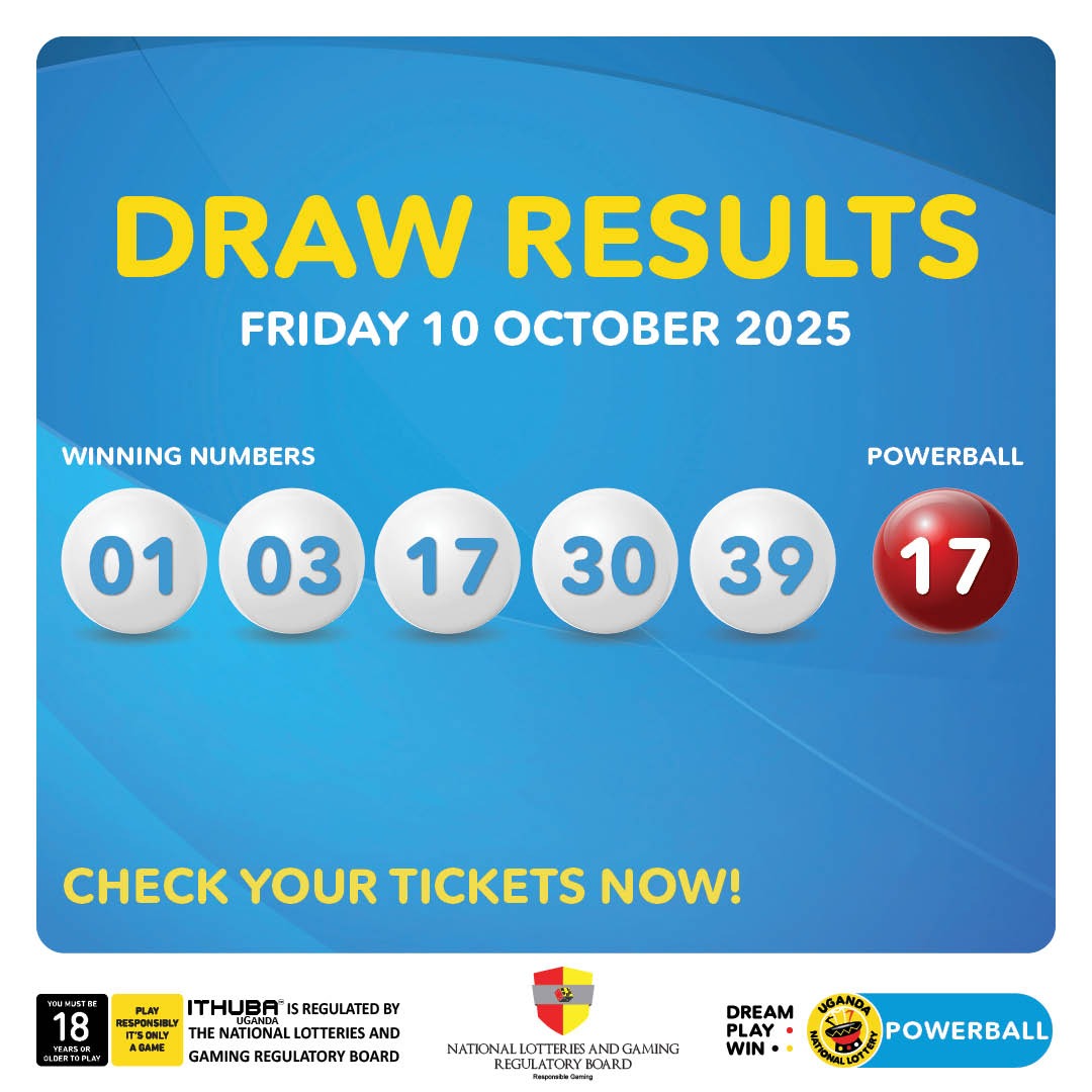 #BillionzZizino #UgandaNationalLottery #POWERBALL#POWERBALL draw results for Friday, 10th October 2025 are: 01, 03, 17, 30, 39 and PB 17.