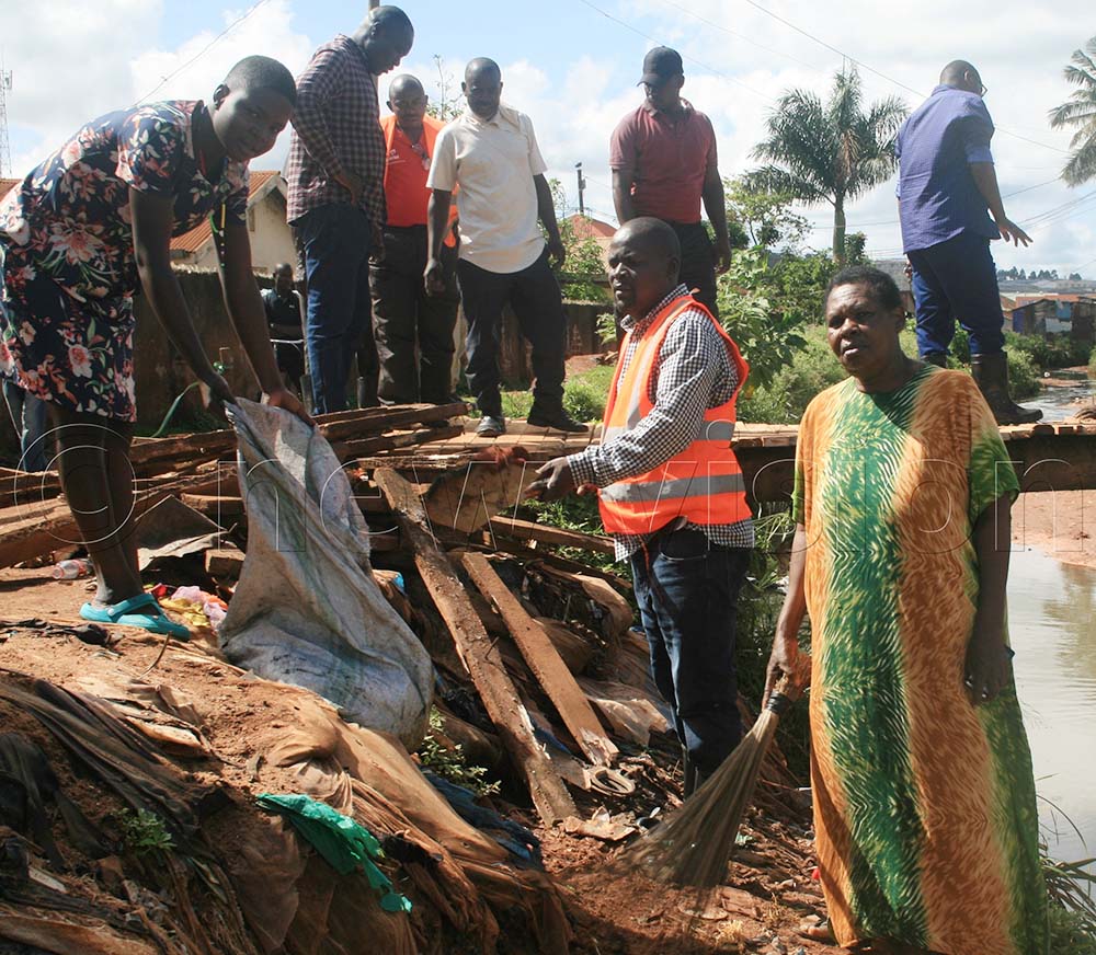 Moses Walusimbi the Mutungo local chairman cleaning the area surrounding the channel with a lady and a youth. (Photos by Maureen Nakatudde)