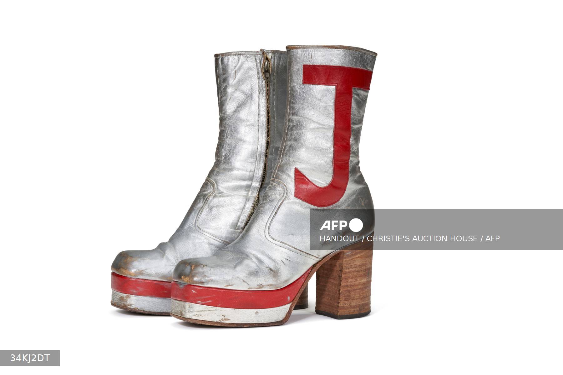 This handout picture provided by Christie's New York on January 11, 2024 shows a pair of silver leather tall platform boots, circa 1971, part of a selection of fashion pieces from Elton John's dazzling stage wardrobe. (AFP)