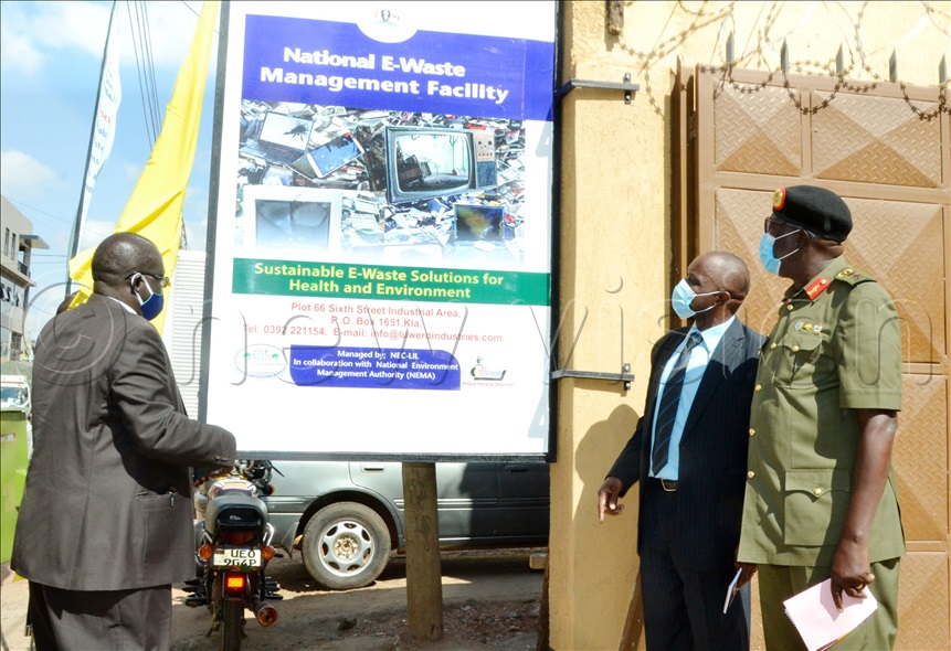(L-R) Tom Okurut Executive Director NEMA officially launching the National E-waste management Centre as David Livingstone Ebiru ED UNBS as Maj. Gen Innocent Oula looks on. This was June 10, 2021. (Pho
