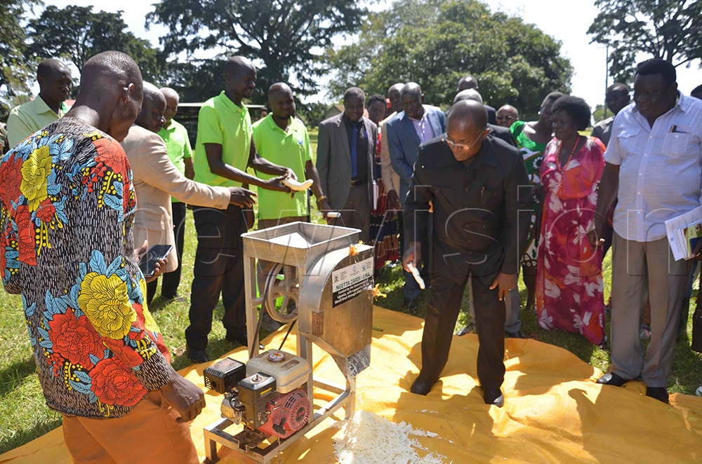 Kyakulaga checking cassava chiper at Ngetta ZARDI in Lira City after commissioning the facilities on 21st sept.