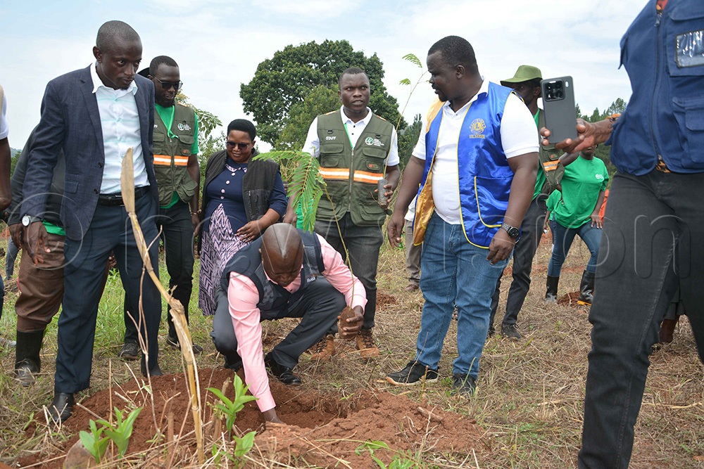 Hoima district officials led by Emmanuel Ssempara, Hoima district CAO, planting a tree as they launched tree planting campaign. (Photo by Peter Abaanabasazi)