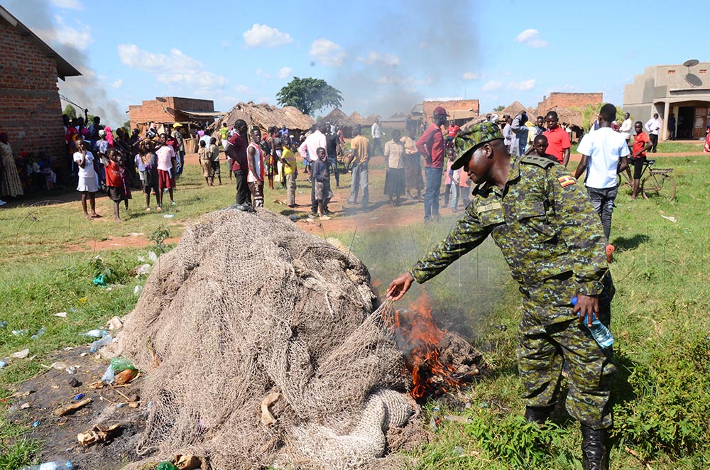 Captain Deogrious Kato of UPDF protection unit burning the illegal nets commonly known as Kokota at Pingire landing site on lake Kyoga. (Photos by Godfrey Ojore)