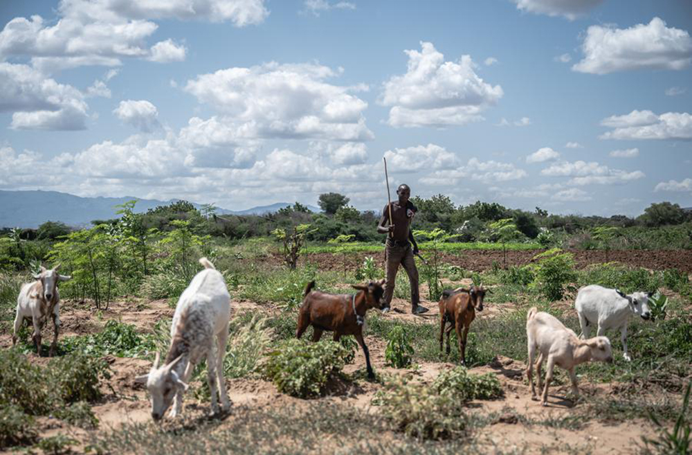 A farmer gets rid of weeds with a flock of sheep at the Choro Farm in Kakuma refugee camp in Turkana, Kenya, June 19, 2024. (Credit: Xinhua)