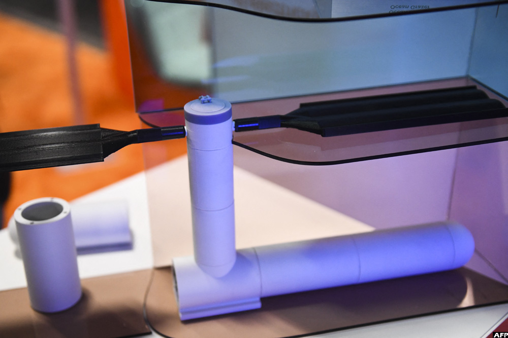 A model of the Ocean Grazer ocean battery, an underwater renewable energy storage system, is displayed during the Consumer Electronics Show on January 6, 2022 in Las Vegas, Nevada. (AFP)