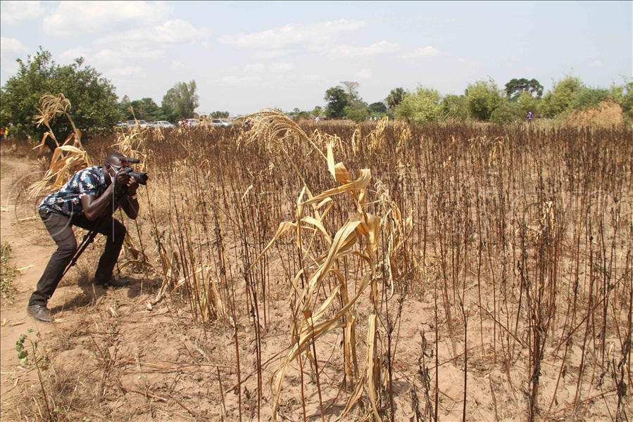 Eddy Olwa, a journalist in positioning to take pictures of a garden destroyed by drought in Kachung, Agwata town council in Dokolo district. (Credit: Hudson Apunyo)
