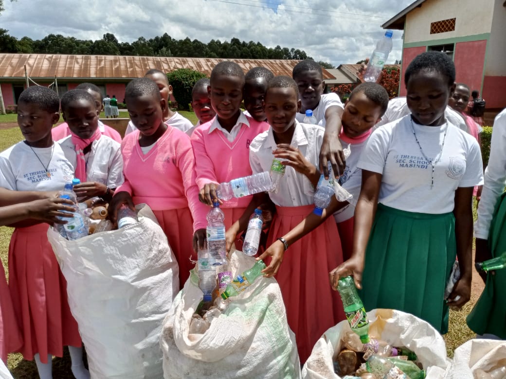 Environment club members of St Theresa Girls SS-Masindi pose for a photo with the collected plastic materials. (Courtesy Photos)