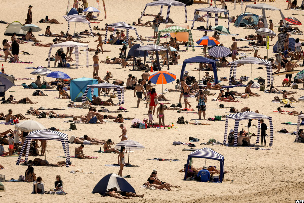 Beachgoers sit and stand on the sand on a hot summer day at Sydney's Bondi Beach in Australia on December 9, 2023. (AFP)