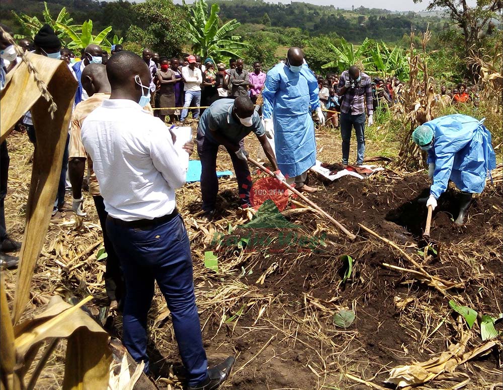 Ab'eby'okwerinda barikuzikuura omutumbi gw'omukazi ogubaire guzikirwe bwanyima y'okugambwa kuba aitsire iba. PHOTOs: Robert Adiga.