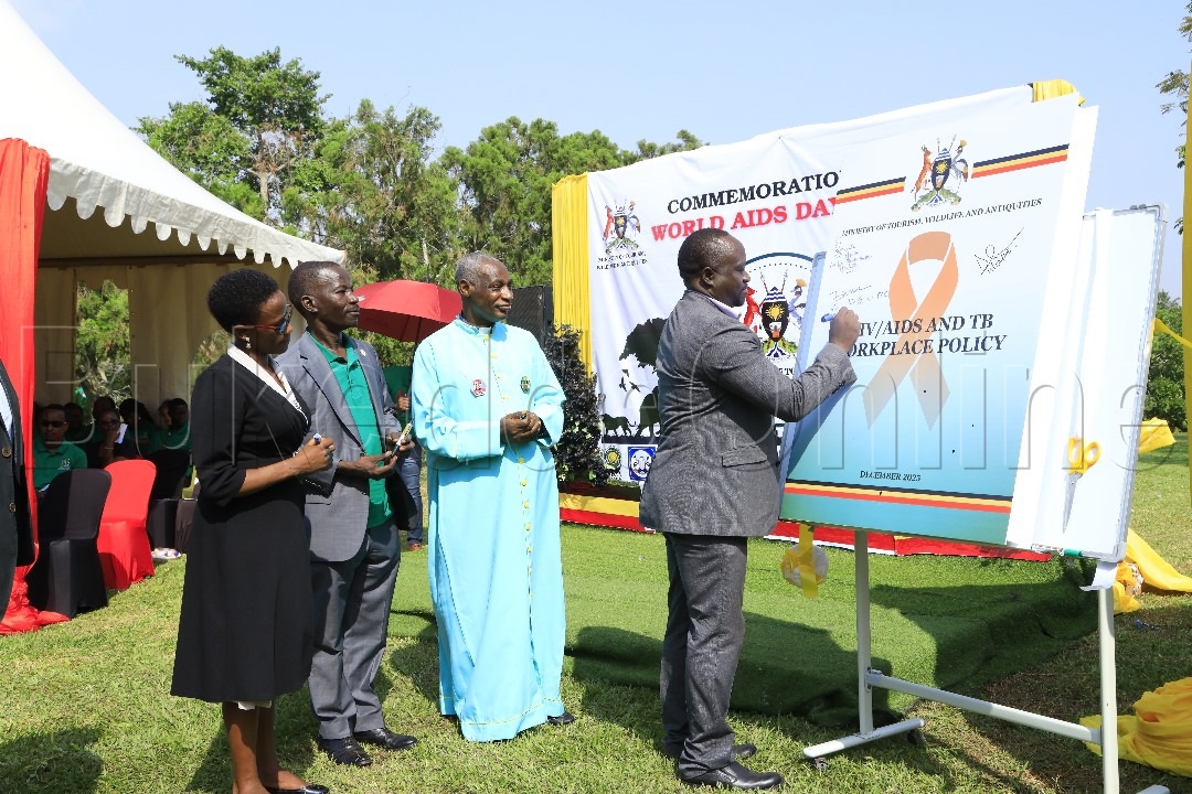 Dr Charles Olaro okuva mu Kitongole kye byobulamu nga ateekako omukono ku kiwandiiko.
