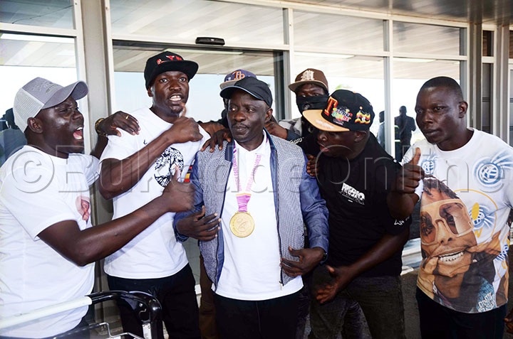 Hillary Musoke Kianja (wakati Mu Nkoofiira Enzirugavu) Ng'ayanirizibwa Abawagizi Be Oluvannyuma Lw'okuwangula Omudaali Gwa Zzaabu Ogwamuweerebwa Parliament Y'e Bungereza