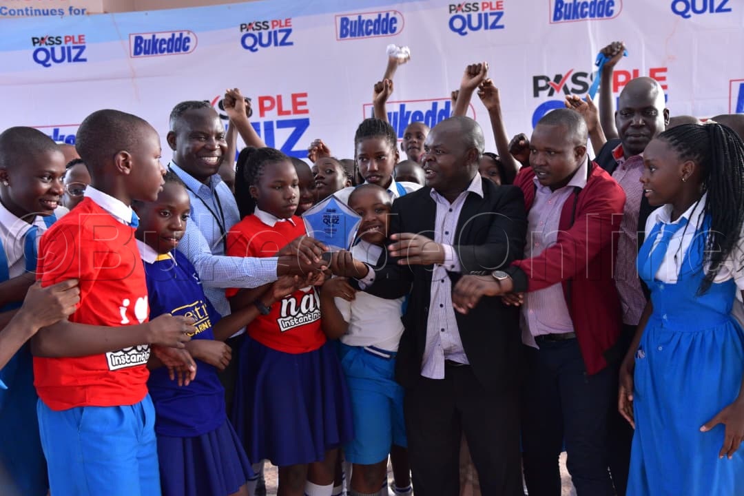 Abayizi n'abasomesa b'essomero lya Blue Pine Primary School Katooke, baasagambizza oluvannyuma lw'okulangirirwa mu bwannantameggwa bw'empaka za Bukedde PASS PLE Quiz 2025.