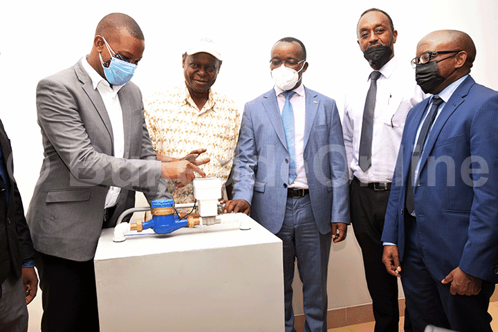 Ying.Gilbert Mugwere (ku kono) okuva mu NWSC ng'alaga mmita empya ze bagenda okukozesa okwewala