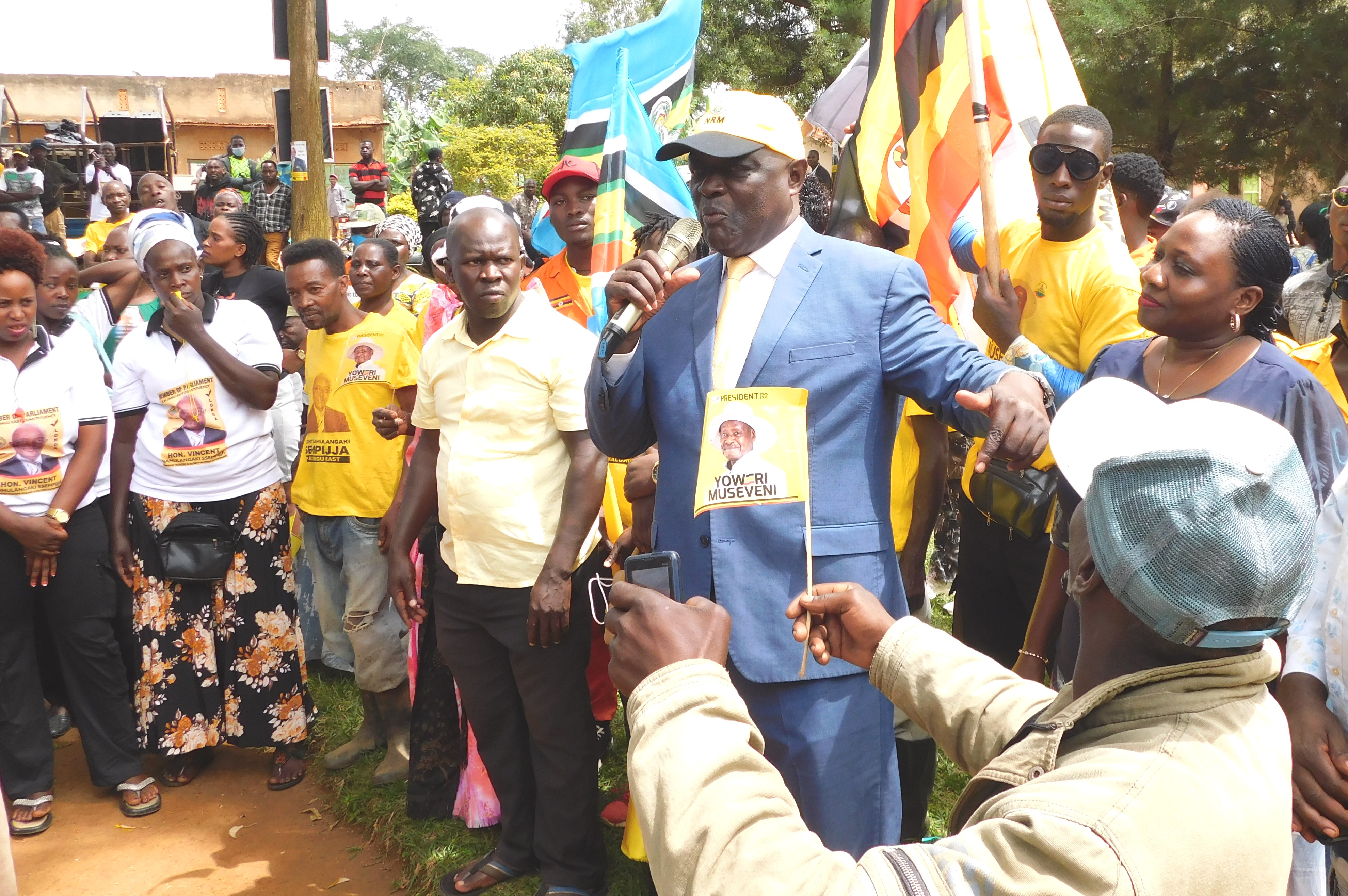 EYALIKO Minisita w'ebyokwerinda Vincent Bamulangaki Ssempijja kkampeyini z'okukiikirira Kalungu East azitandikidde mu Lukaya Town Council wakati mu kuwaga n'abamu ku bawagizi be abanekedde mu ngoye eza kyenvu okubadde ebifaananyi bye n'ebya Pulezidenti Museveni naye gw';asabidde akalulu.
