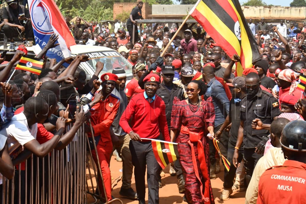 Pulezidenti wa NUP Robert Kyagulanyi Ssentamu Bobiwine ne mukyala we Barbie batuukidde mu mizira ku kissaawe Kya Bulumba mu disitulikiti ye Kaliro wakubye olukungaana lwe olusoose olunaku olwaleero.