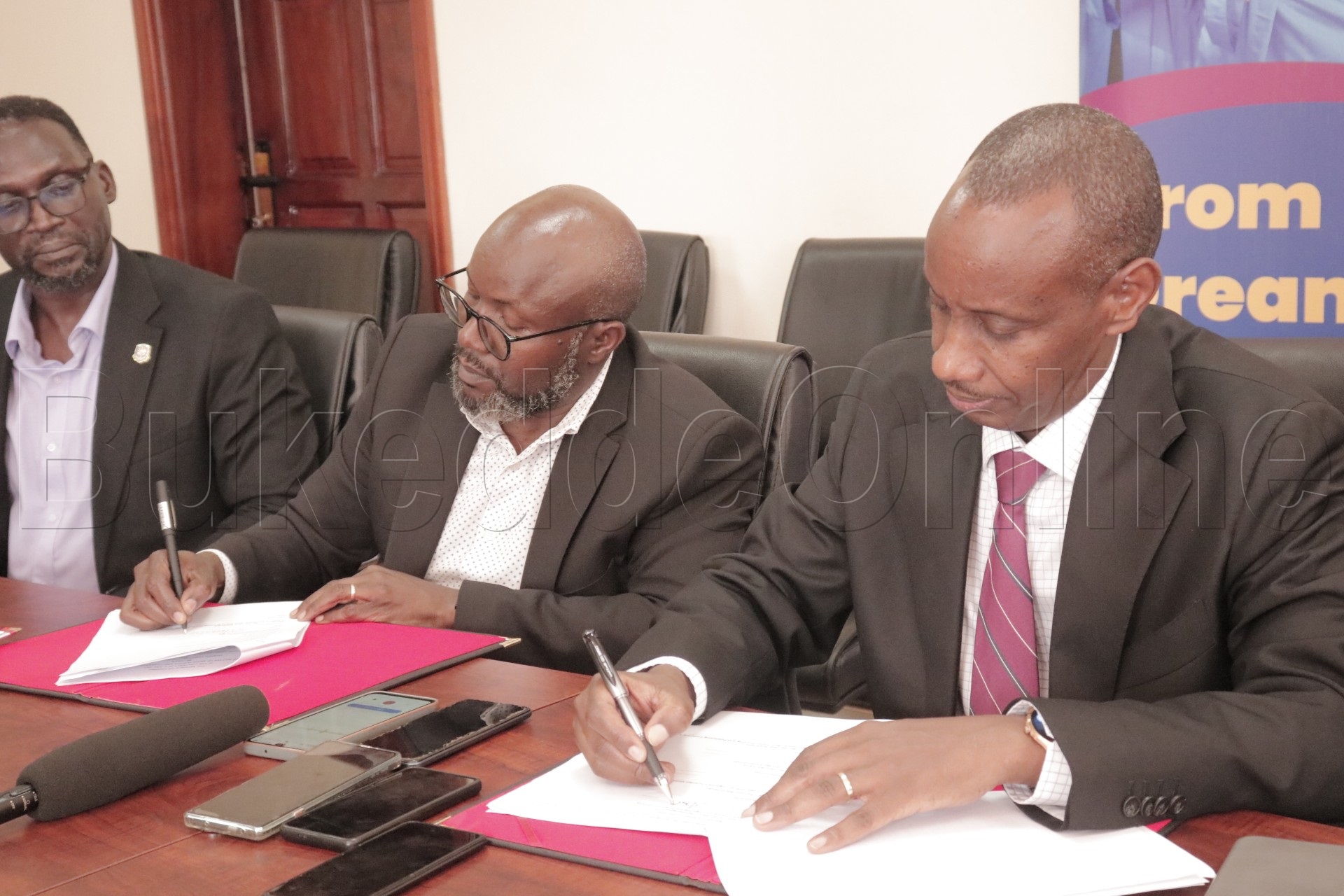 Akulira Vision Group Don Wanyama n'akulira UCU Aaron Mushengyezi nga bassa omukono ku ndagaano ekoleddwa