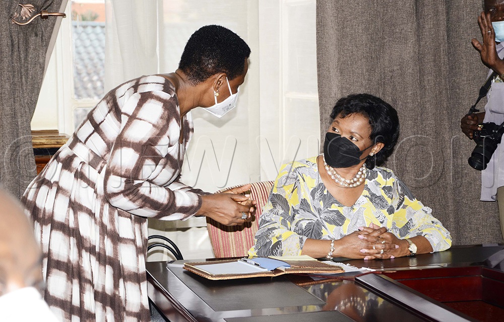 Col Nakalema interacts with Sylivia Nagginda (right), the queen of Buganda during the meeting at Bulange Mengo on January 14 2022. Photos by Juliet Kasirye