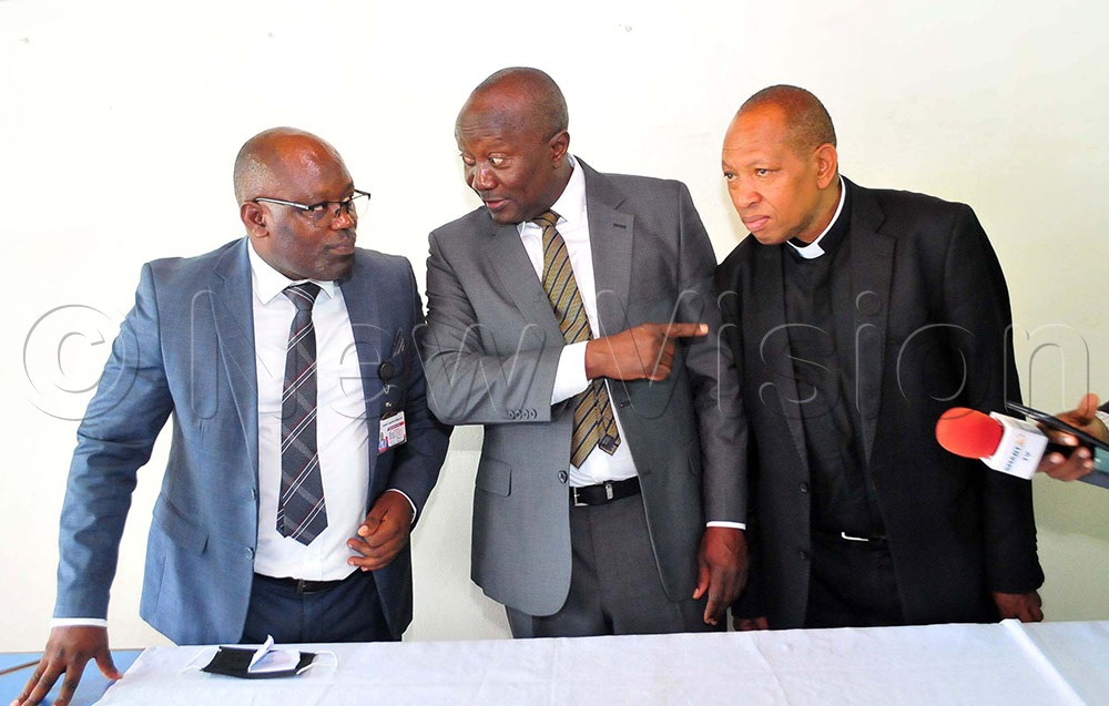 Ivan Asiimwe (L) CEO Uganda Cooperative Alliance chats with Fredrick Ngobi Minister of State for Cooperatives as Safari Emmanuel Treasurer Uganda Cooperative Alliance looks on. Photo by Nicholas Oneal