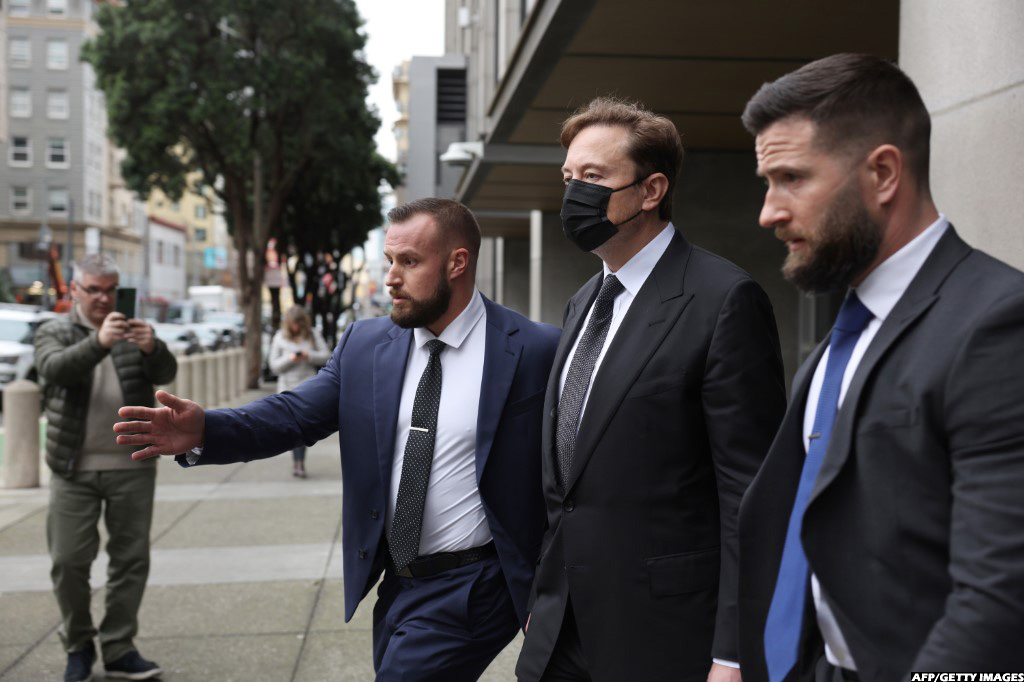 Tesla CEO Elon Musk (C) leaves the Phillip Burton Federal Building on February 3, 2023 in San Francisco, California. (AFP/Getty Images)