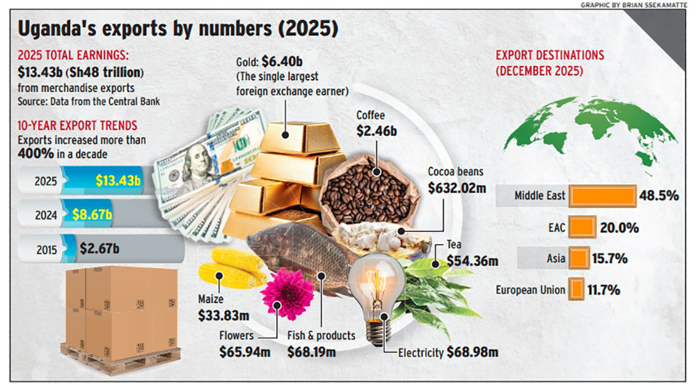 KAMPALA - Uganda earned $13.43 (sh48 trillion) from merchandise exports in 2025, according to official export data from the Central Bank. This represents a sharp increase from $8.67b