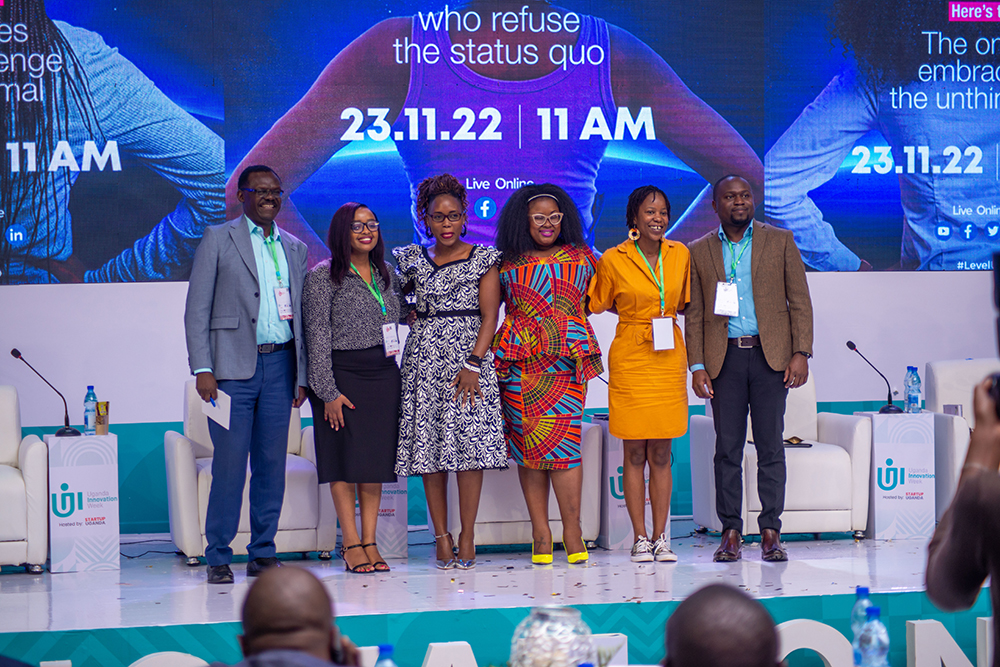Patrick Ayota (left) Deputy Managing Director NSSF posses for a photo with some of the women entrepreneurs after the launch in Kampala, far right is Richard Zulu Outbox Team Lead. (Courtesy photo)