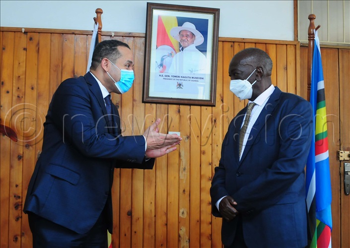 Francis Mwebesa (R), the Minister of Trade, Industry and Cooperatives chats with Jamal al Madani, the Saudi Arabian Ambassador to Uganda during his courtesy visit. Photos by Nicholas Oneal