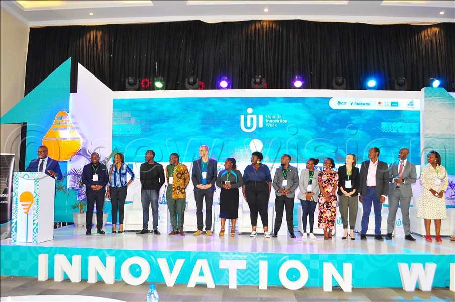 Mathias Katamba, the Managing Director and Chief Executive Officer DFCU bank (L) speaking during the launch of the Uganda Innovation week as the organizers of the event look on. Photos by Shamim Saad