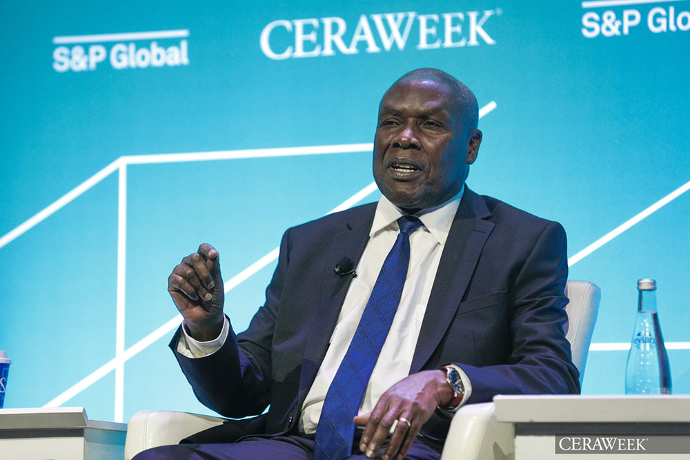 Opolot Sidronius Okaasai the state minister for state for energy speaking during the Cambridge Energy Research Associates Week 2022 held in Texas, USA. Courtesy photo/PAU.