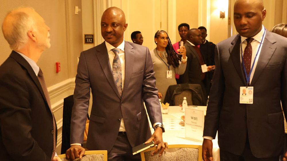 Musasizi (Right) and Ggoobi interacting with an American investor during the Uganda-USA Investment Forum on Monday, April 13, 2026, in Washington, DC. (Courtesy)