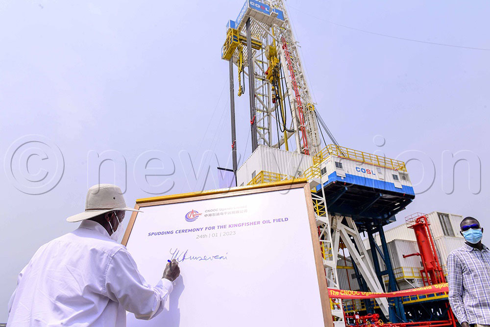 In this file photo, Uganda's President Yoweri Kaguta Museveni launches Oil production by CNOOC Rig at Kingfisher in Kikuube district. Uganda’s economy is projected to grow strongly, with gross domestic product (GDP) expected to rise from $59.3b (about sh222.7 trillion) in the current financial year to $66.1b (sh250 trillion) next financial year (2025/26).