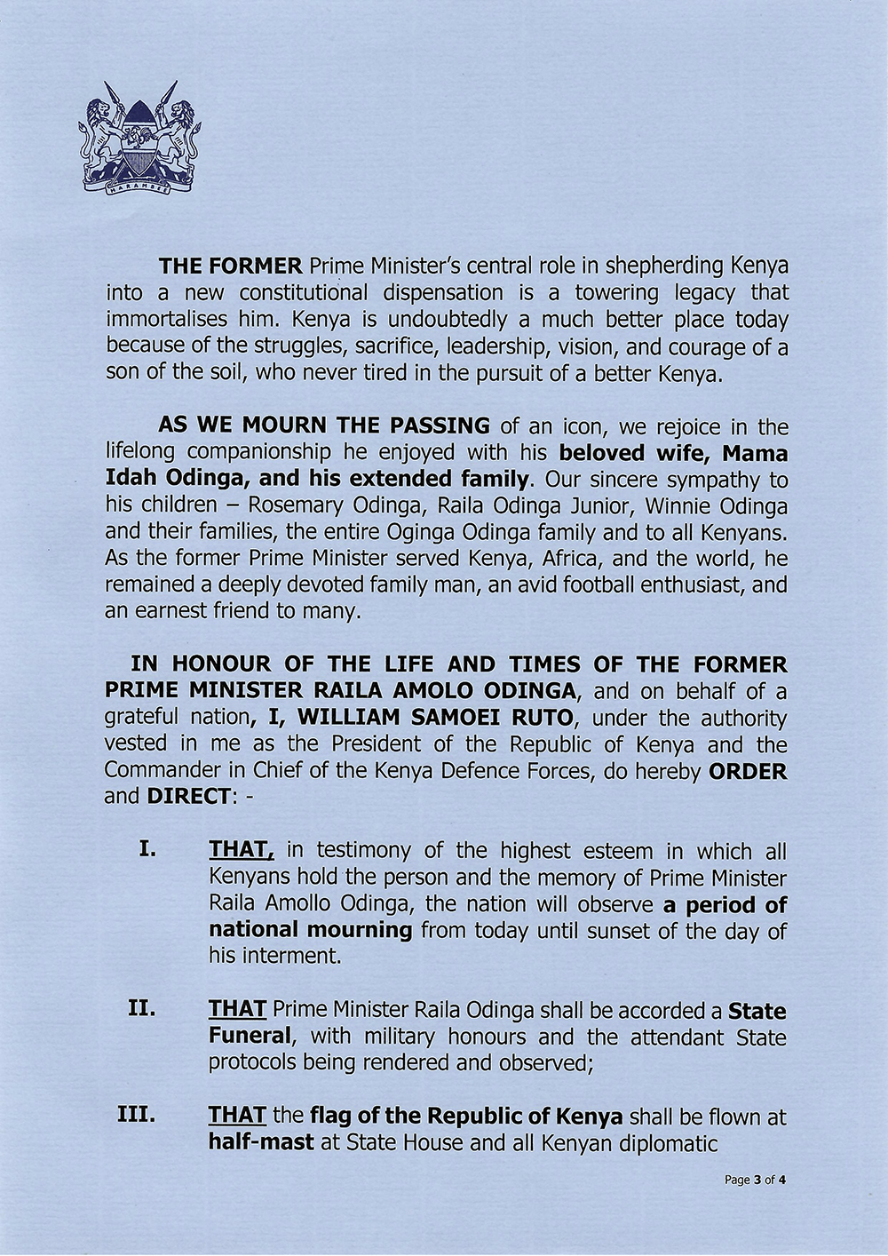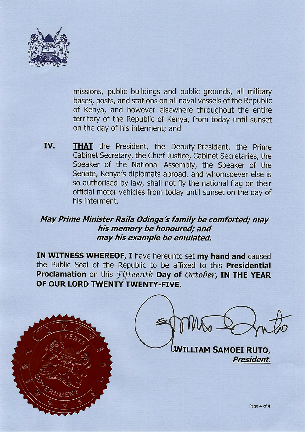 Today, our nation mourns the passing of a towering statesman, a gallant fighter for democracy, and a son of Kenya whose life was defined by courage, conviction, and an unyielding love for his country, Rt Hon. Raila Amolo Odinga.