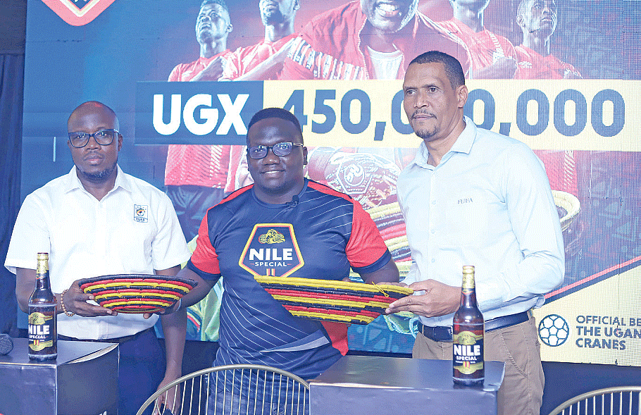 Kitunzi wa Nile Special, Joel Galla (wakati) n'akulira emirimu mu FUFA, Edgar Watson (ku ddyo) nga banjula ssente ezaavudde mu 'Cranes Kabbo'