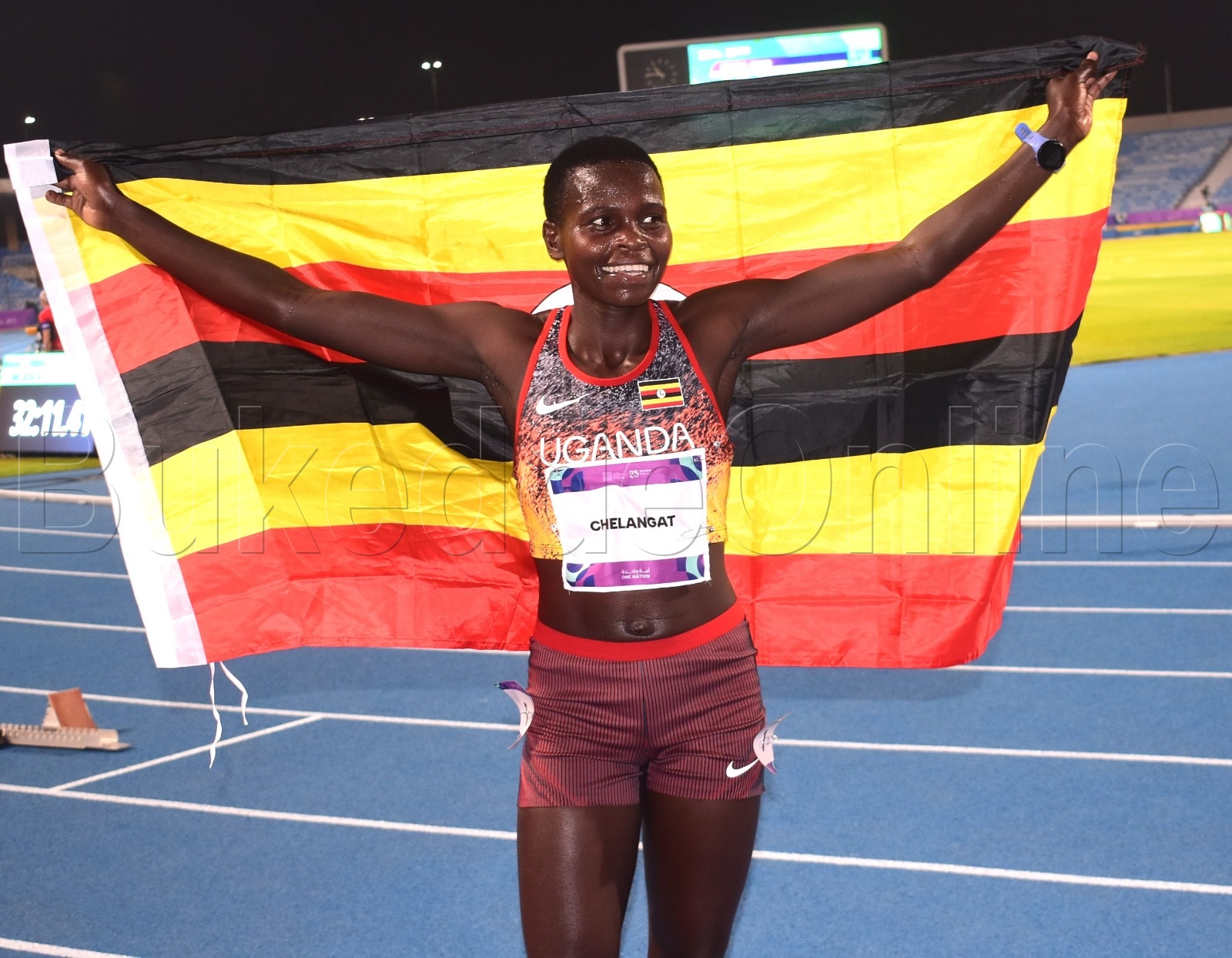Munnayuganda Rebecca Chelangat awangulidde Uganda omudaali gwa zaabu ogwokusatu mu mpaka za Islamic Solidarity Games egiyindira mu kibuga Riyadh ekya Saudi Arabia.