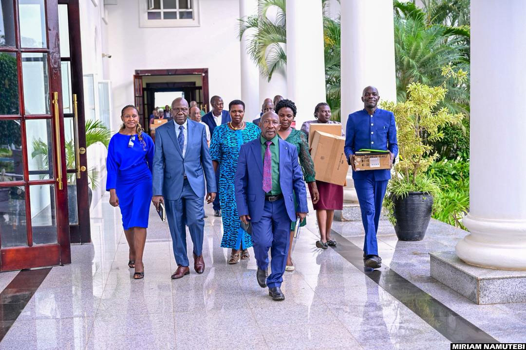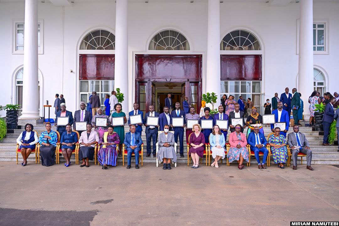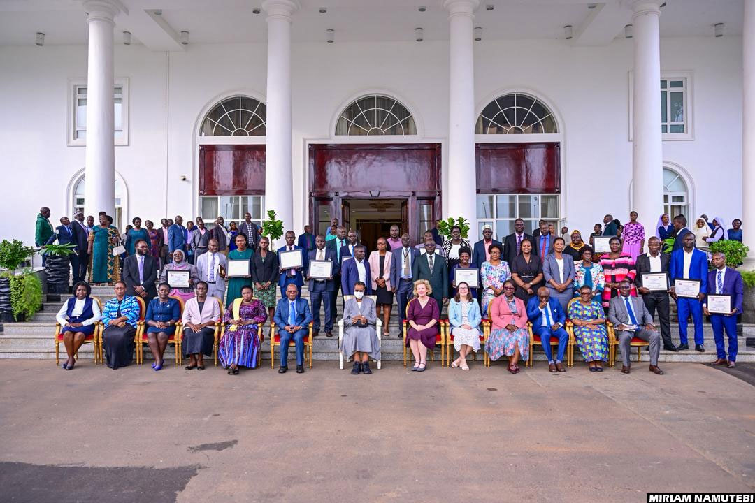 The First Lady and Minister of Education and Sports, Janet Museveni (C), posing for a group photo with the 2025 Teachers Making a Difference winners (standing) and other officials at State House, Entebbe on March 18, 2026. (Credit: Miriam Namutebi)