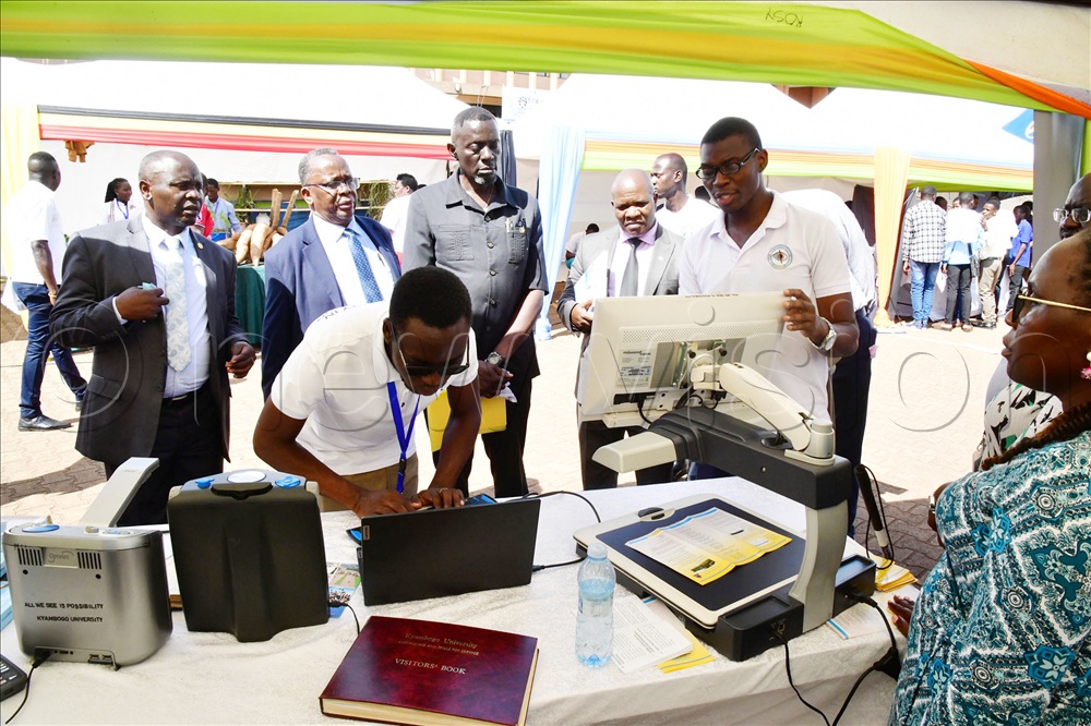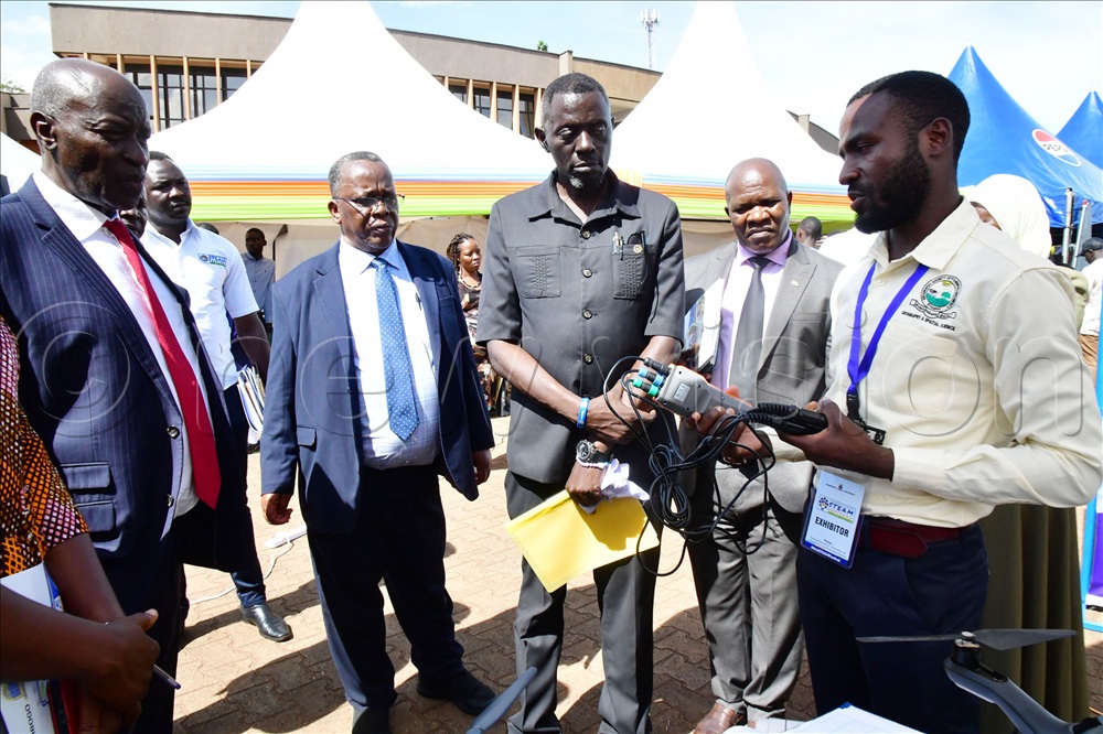 L-R: Professor Eli Katunguka, Vice Chancellor, Kyambogo University, Prof. Fred Wabwire-Mangen, Chairperson of the University Council and Timothy Musoke Ssejjoba, the Acting Commissioner for University Education & Training Ministry of Education and Sports (representing the Minister for Higher Education JC Muyingo) paying attention to Bwire Derick Maliba from the Department of Geography (right) as he explained about the geography information system & remote sensing tools. (Photos by Mpalanyi Ssentongo)