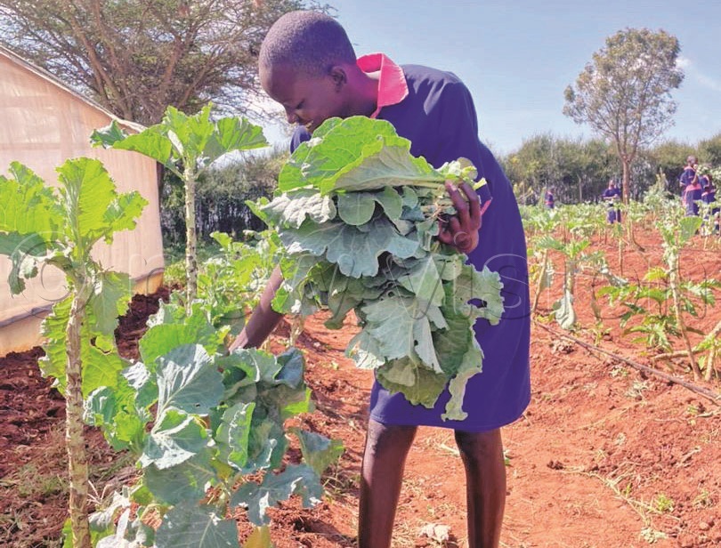 A pupil of Pajar Primary School in Kaabong town council, Kaabong district, harvests spinach from the school garden. Due to the feeding initiative, more girls are in school.