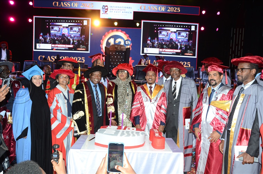 International University of East Africa (IUEA) officials, invited guests, and graduates cut cake to celebrate during the 12th graduation ceremony of the International University of East Africa at the main campus in Kampala on November 27, 2025.