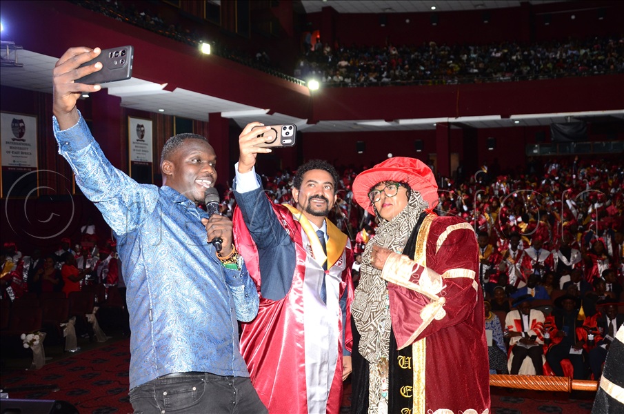 (L-R) Daniel Choudry, H.E Amb. Hassan Alwi and Amb. Dr. Amina C. Mohamed the University Chancellor International University of East Africa (IUEA) taking a selfie during the 12th graduation ceremony of the International University of East Africa at the main campus in Kampala on November 27, 2025.