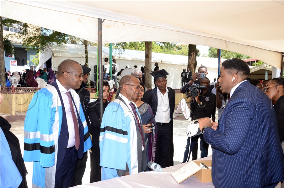Gael Ongor Iko (L) one of the innovators of the packaging machine explaining to officials of International University of East Africa (IUEA) and guests how it was built and how it is used. This was during the 12th graduation ceremony of the International University of East Africa at the main campus in Kampala on November 27, 2025.