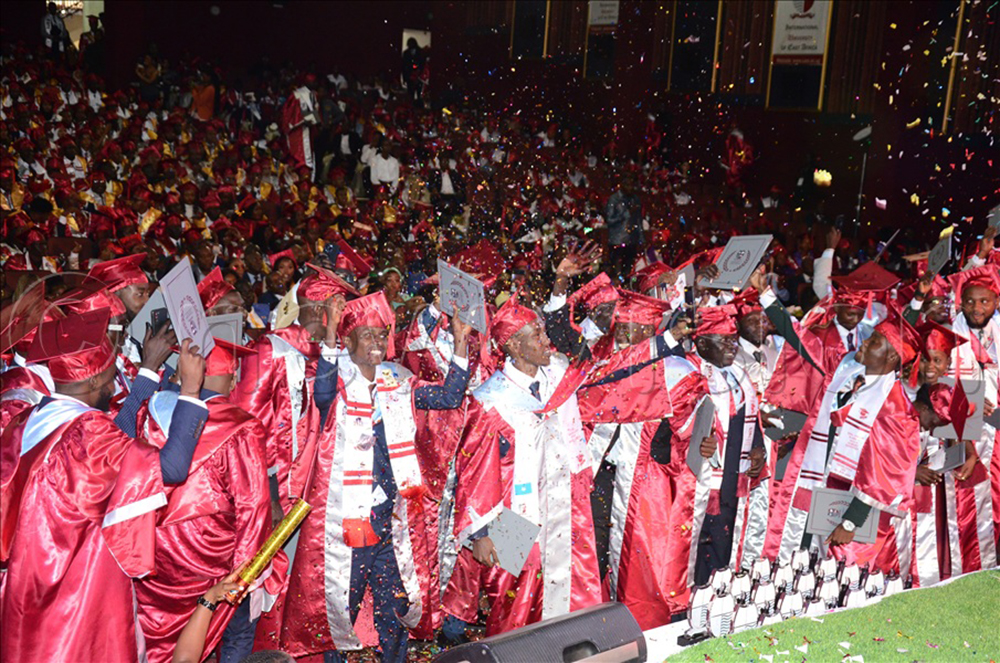 Graduates jubilating during the 12th graduation ceremony of the International University of East Africa at the main campus in Kampala on November 27, 2025.