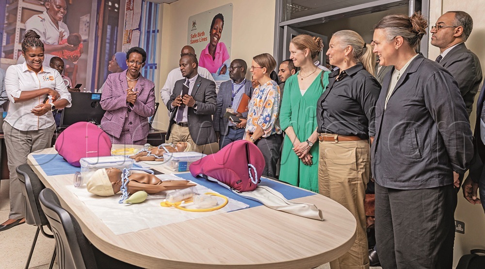 Atwine (second-left) leading a delegation from European Union, the United Nations Population Fund and other partners on a tour of the National Knowledge Hub at Kawempe National Referral Hospital after the launch of the facility on Tuesday. (Credit: John Musenze)