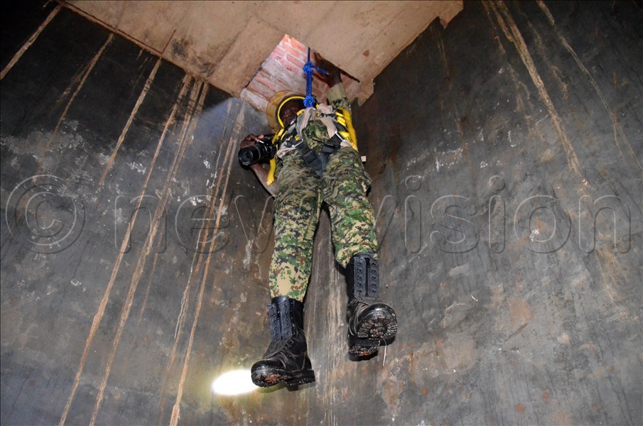 Security operatives being lowered into the ADF tunnel in Luwero on Thursday. Photos by Stuart Yiga