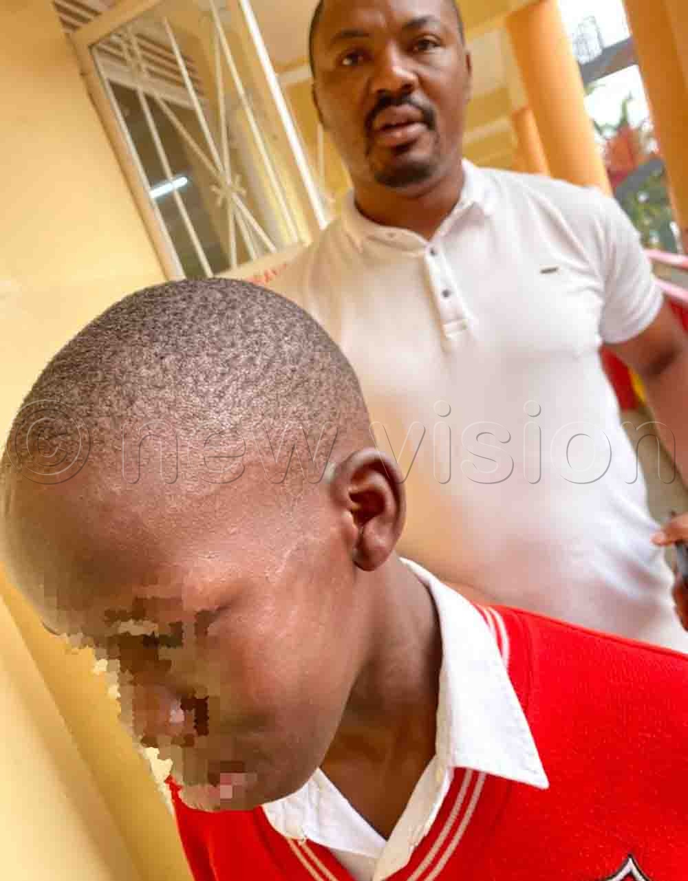 The Primary Five pupil of Hillside Primary School, Naalya with a swollen cheek bearing a pattern of fingers after he was allegedly slapped by the teacher, Mugabi, at the back.