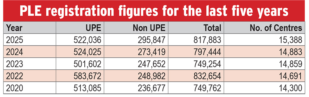 Overall, a total of 817,883 candidates from 15,388 examination centres registered for the 2025 Primary Leaving Examination (PLE), compared to 797,444 candidates in 2024.