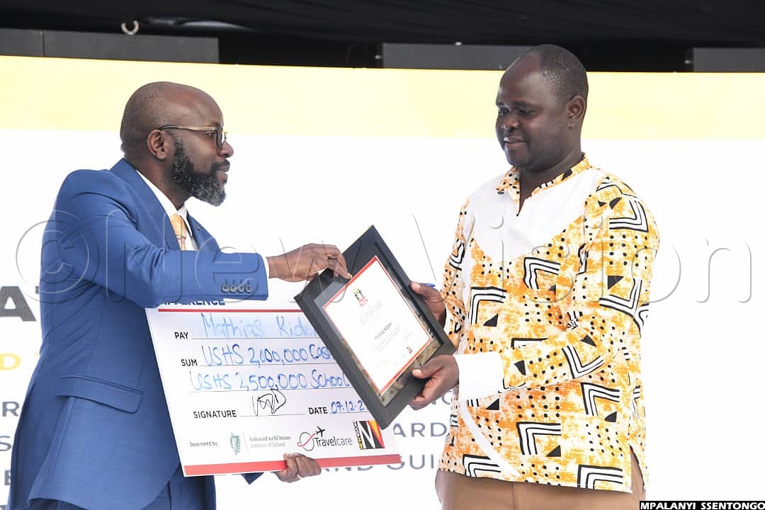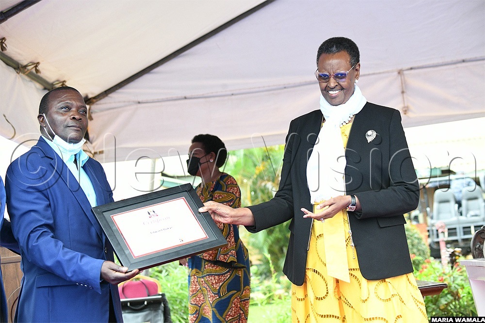 Edward Bukye, the overall winner, is a teacher of Nakalama Primary School in Iganga district in Busoga sub-region. He receives a plaque and certificate presented to him by the chief guest, Janet Museveni.