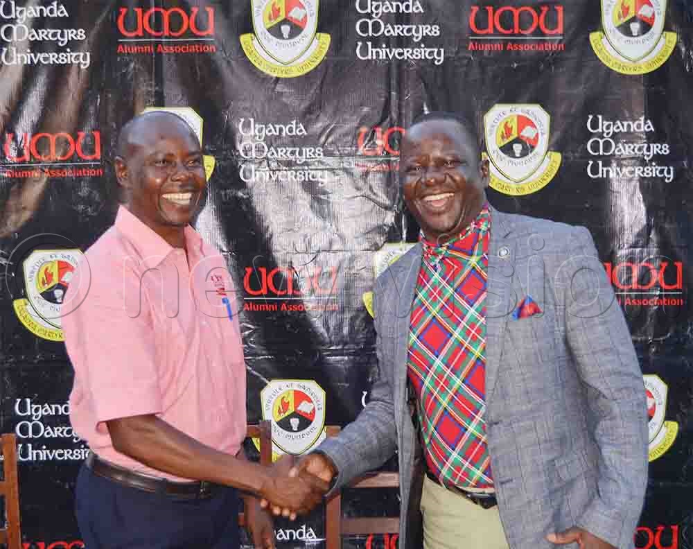 Out-going President of UMU Alumni's Association, Ambrose Kibuuka (L) shakes hands with his newly-elected successor, Robinson Bernard Magulu (R) after the alumni's Annual General Meeting.
