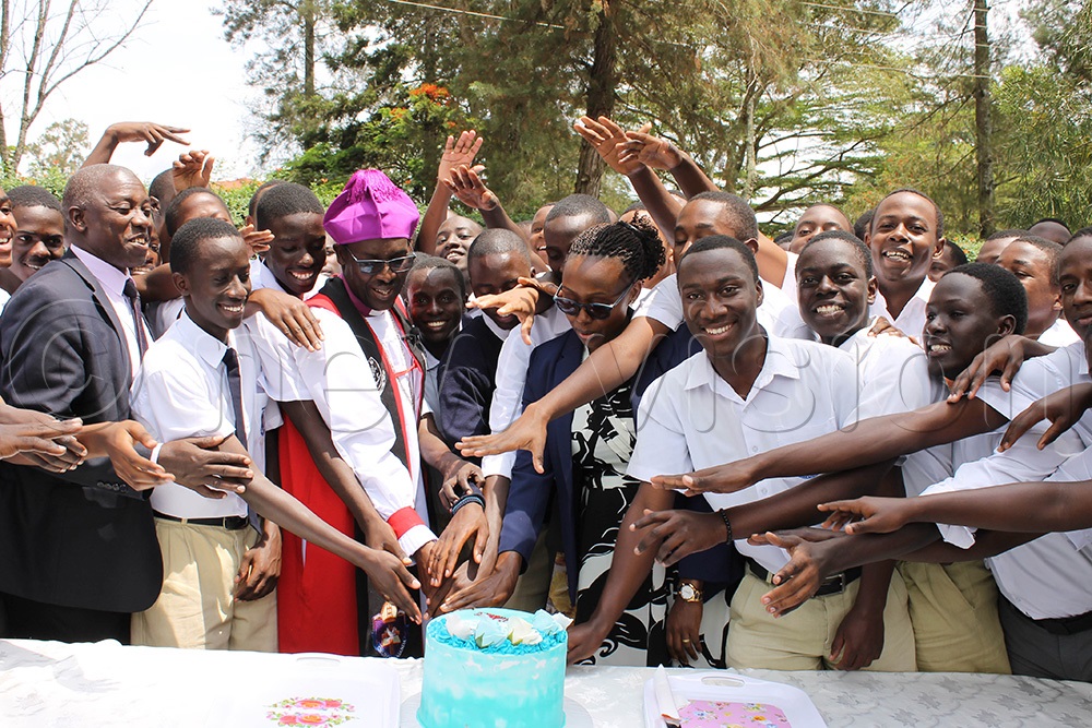 Ankole Anglican Diocese Bishop Fred Sheldon Mwesigwa joined by teachers of Mbarara High School hands over a success card to candidates. (Photo by Abdulkarim Ssengendo)